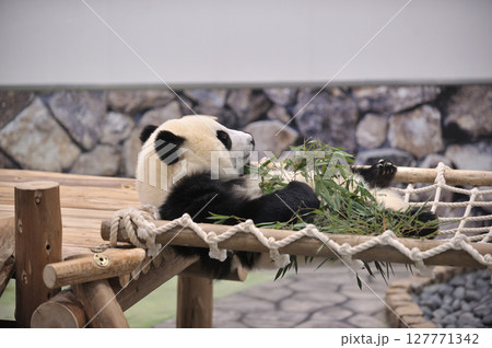 ウッドデッキでくつろぐ赤ちゃんパンダ
