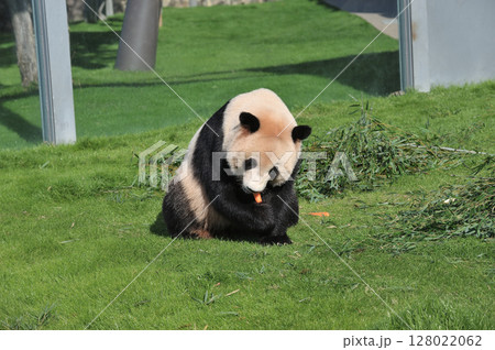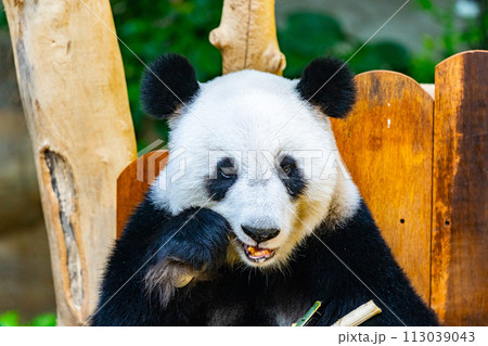 細めのタケノコを美味しそうに食べるジャイアントパンダ