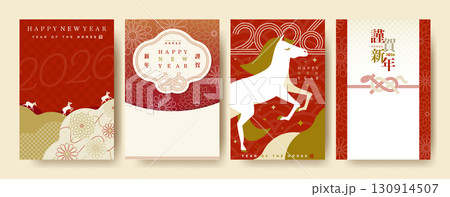 2026年午年の馬イラストや花、水引の日本のお正月の年賀状_和風の新年テンプレート_広告やはがき等