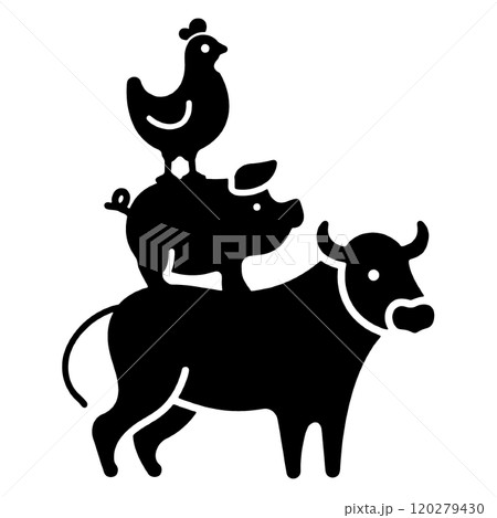 牛と豚と鶏のタワーのシルエットイラスト 食肉のコンセプト 透過背景の切り抜き