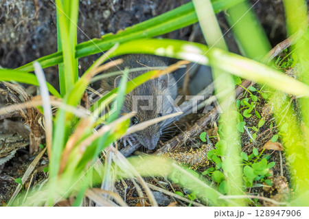 A closeup of a Common vole, Microtus arvalis, on the ground with a blurry background
