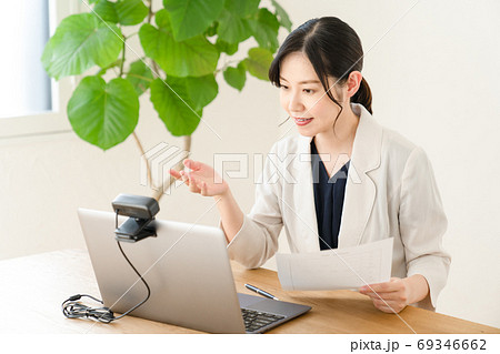 ウェブカメラに向かって話す若い女性 オンライン面接 ビデオ通話 イメージ
