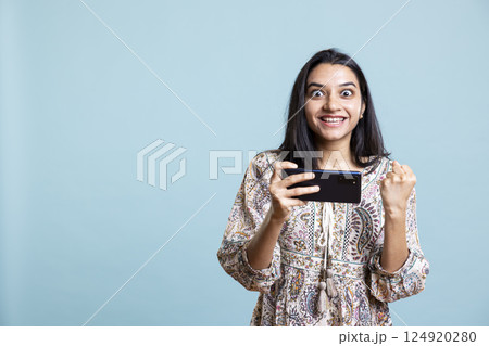 Indian jolly gamer winning the video gaming championship in studio, feeling confident and happy with her victory. Ecstatic woman entertained by video games on mobile phone, enjoying leisure time.