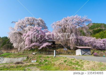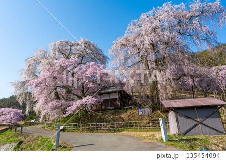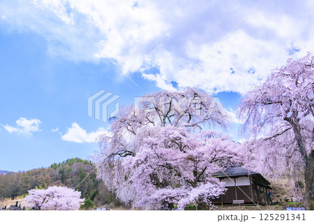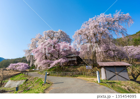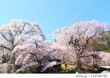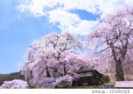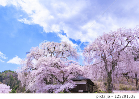 長野県伊那市高遠町勝間 薬師の桜と呼ばれる勝間薬師堂の満開のシダレザクラやタカトオコヒガンザクラ