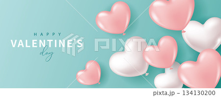 飛舞的愛心造型氣球在藍綠色背景,情人節、母親節、婦女節、生日、婚禮、紀念日橫幅海報廣告宣傳單素材圖