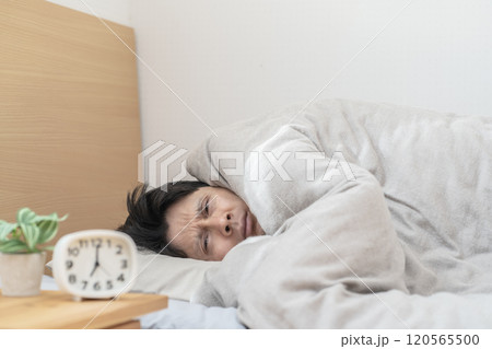 ベッドで眠る男性 寒くてベッドから出られない男性