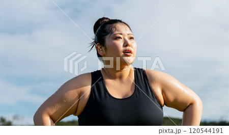 40代女性爽や笑顔腕組み自然光ポートレイト