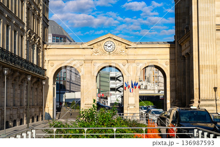 Scenic sunny view of the historic stone archway entrance with a clock and French flags at the Gare du Nord train station in Paris, Ile de France, France.