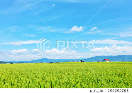 北海道 夏の青空と田んぼ風景