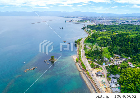 ドローン撮影|夏の爽やかな青空と絶景の観光名所の雨晴海岸の空撮|富山県高岡市