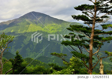 丹沢の袖平山 袖平山北尾根より望む 日差しが新緑の大室山を照らす
