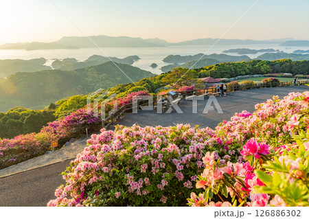 (長崎県)長串山公園 満開のツツジの向こうに北九十九島・夕景