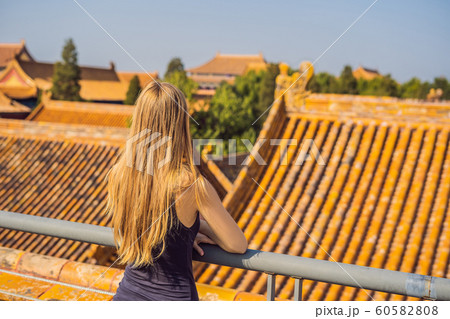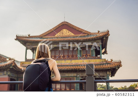 Enjoying vacation in China. Young woman in Forbidden City. Travel to China concept. Visa free transit 72 hours, 144 hours in China