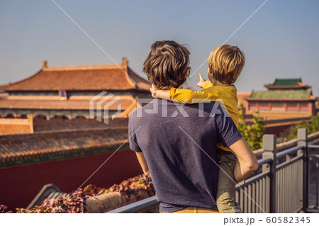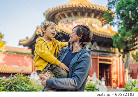 Enjoying vacation in China. Dad and son in Forbidden City. Travel to China with kids concept. Visa free transit 72 hours, 144 hours in China