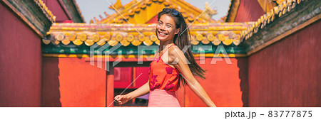 China travel Asian woman tourist smiling happy in Beijing city, panoramic banner young people lifestyle.
