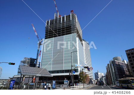 日本の横浜都市景観 桜木町駅入口から、建設中の横浜市役所新庁舎などを望む