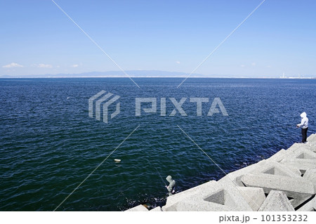 大阪 泉大津 助松埠頭北岸壁の釣り人と大阪湾、神戸市街地(春)