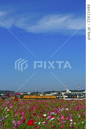 コスモス畑の向こうを通り過ぎる三岐鉄道北勢線の黄色い電車