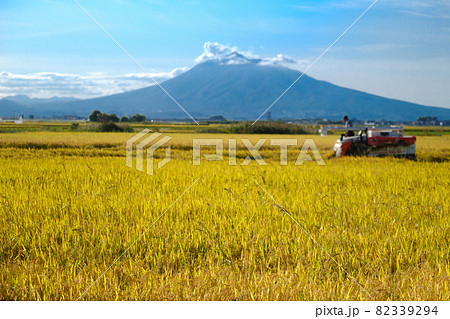 黄金に輝く米の収穫をする津軽の風景には岩木山の勇姿
