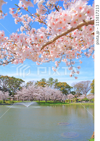 愛知県名古屋市、名城公園御深井池と桜の風景