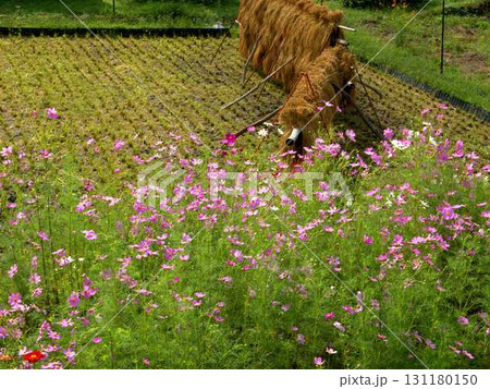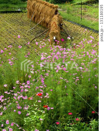 京都・美山町のかやぶきの里の稲刈りが終わった田んぼに咲くコスモスの花