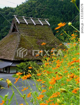 京都・美山町のかやぶきの里に咲くコスモスの花と茅葺き屋根の民家
