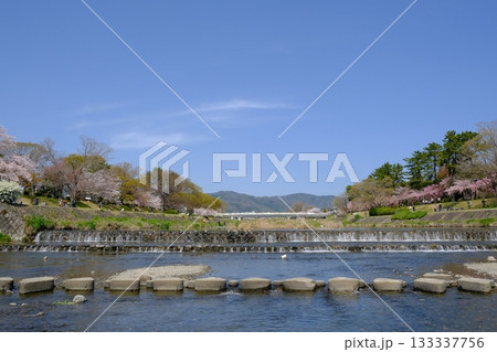 花咲く季節の京都市賀茂川の眺め