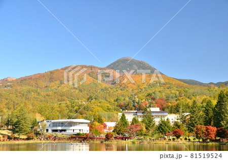 秋の長野県の白樺湖西側公園付近から紅葉越しに蓼科山方面を見る