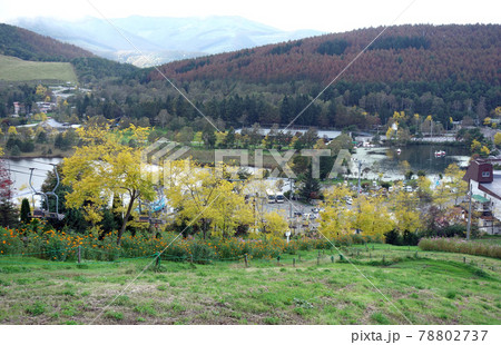 秋の長野県の白樺湖展望台付近から蓼科山,白樺湖方面の眺望