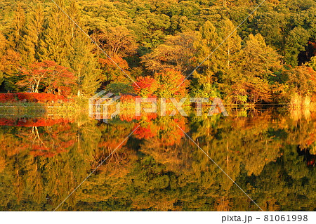 長野県茅野市北山 紅葉の蓼科湖水面の反射