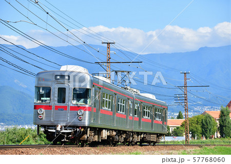 北志賀の山々をバックに走る長野電鉄3500系電車