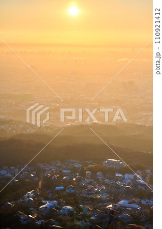 京都府最南端木津川市木津の街を望む高台からの夕景 日が傾き夕日に照らされる木津の街#9