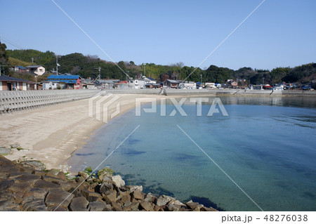笠岡諸島最大の島・北木島 初夏の大浦地区の砂浜と地区の鎮守・諏訪神社の鳥居 岡山県笠岡市