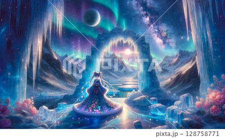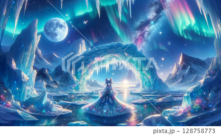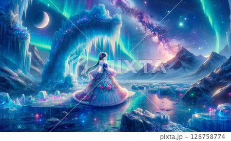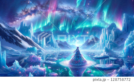 オーロラの下で氷の世界に佇むドレス姿の若い女性。ファンタジーアニメ風のイラス