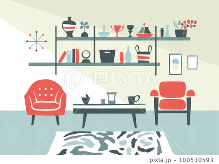おしゃれなリビングのイラスト レトロモダンな部屋のインテリア
