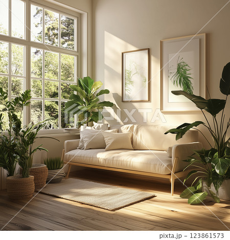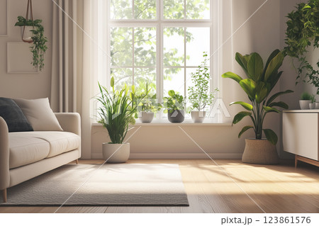 おしゃれなリビングのイラスト 猫がくつろぐ北欧風の部屋インテリア