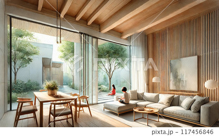 明るいリビングでくつろぐ子どものイメージ水彩画