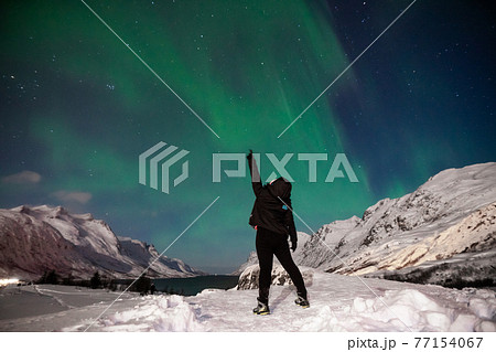 オーロラ鑑賞 360度オーロラの夜空 フィヨルドのオーロラ 砂浜で見るオーロラ 緑の夜空