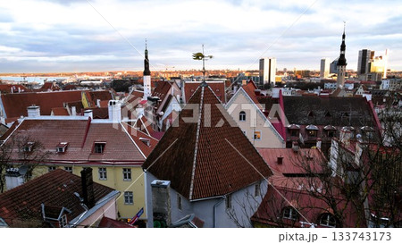 エストニアの世界遺産タリン旧市街の夕景 赤い屋根と教会の塔が輝く美しい街並みのパノラマ