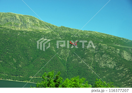 ハダンゲンフィヨルドの峡谷を飛ぶ小型軽飛行機