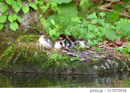 北海道の公園の池の岸で休むカワアイサのヒナたち
