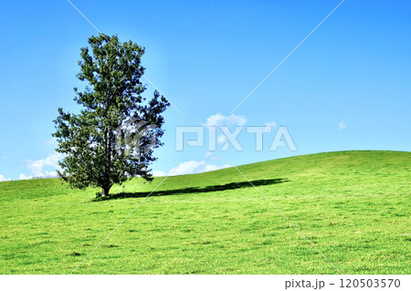 北海道美瑛町の爽やかな青空と雲と草原のシンプルな風景