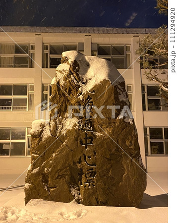 【観光スポット】北海道富良野市・富良野小学校に設置された北海道中心標「北海道のへそ」(雪の日の夜)