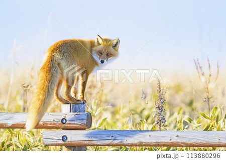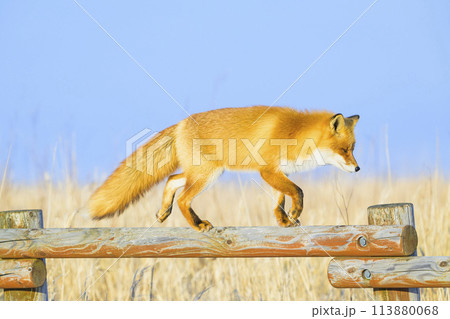 柵の上を歩くキタキツネ