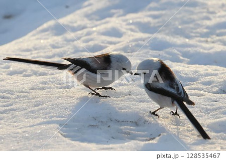 雪の上でささやきあうシマエナガ