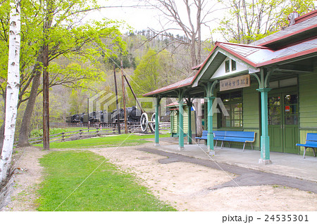 神居古潭(かむいこたん)、旧神居古潭駅の駅舎とSL蒸気機関車(C57、D51)と新緑/北海道旭川市