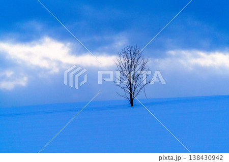 雪深い真冬の北海道美瑛の丘にひっそりと佇む一本の木