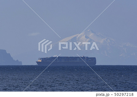 春の北海道松前町白神岬から津軽海峡を行きかう貨物船と津軽半島そして残雪の岩木山の風景を撮影