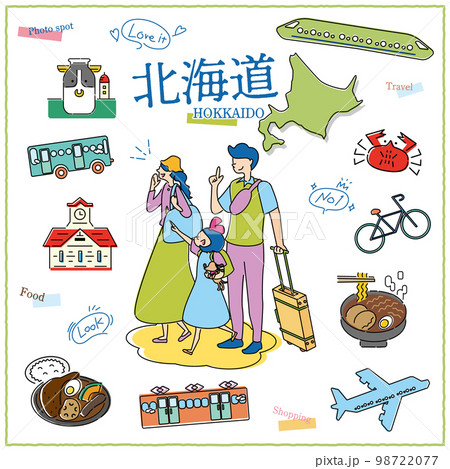 日本の北海道のグルメ観光を楽しむ旅行客の家族とアイコンセット(線画)