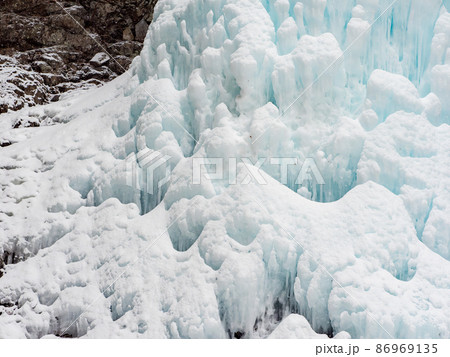 厳冬の景色 ダイナミックな凍った滝 大禅滝の大氷柱